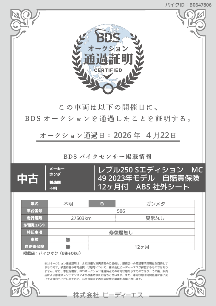 オークション通過証明プレビュー